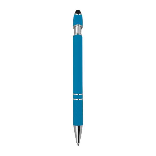 Aluminium balll pen with silver applications, blue-writing big refill, touch function and patterned grip zone.