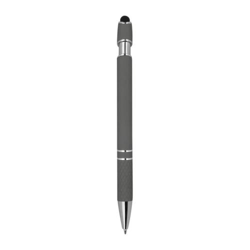 Aluminium balll pen with silver applications, blue-writing big refill, touch function and patterned grip zone.