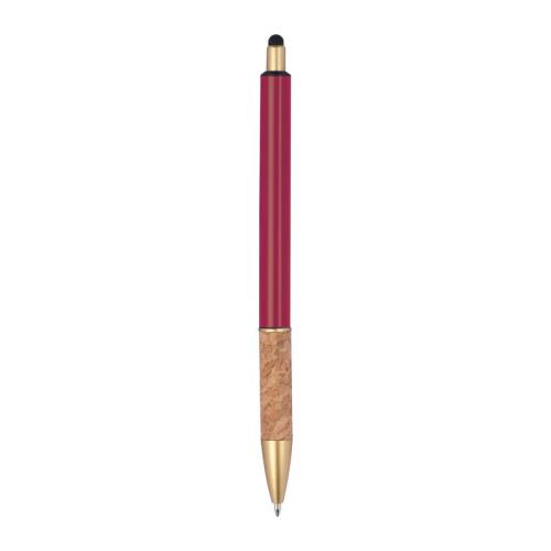 Metal ball pen with golden applications, blue-writing refill and cork grip zone.