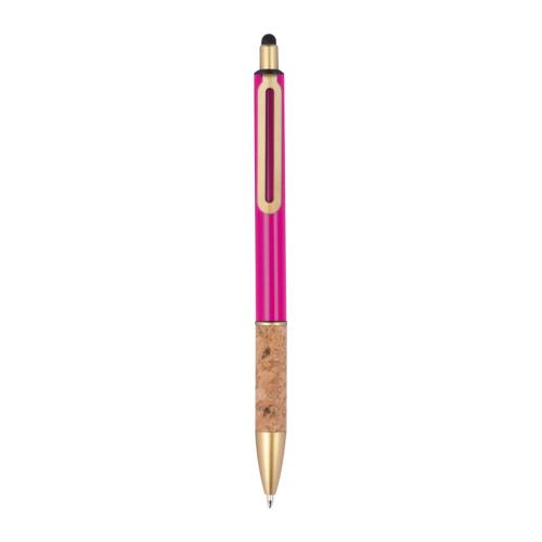 Metal ball pen with golden applications, blue-writing refill and cork grip zone.