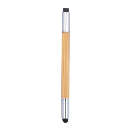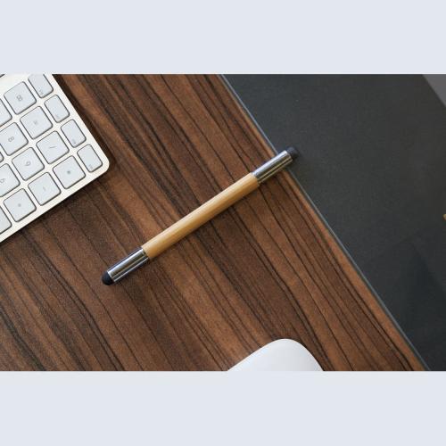 2in1 bamboo writing instrument consisting of a blue writing pen, touch function, an erasable endless refill and a matching eraser.