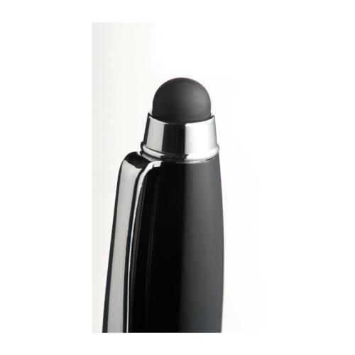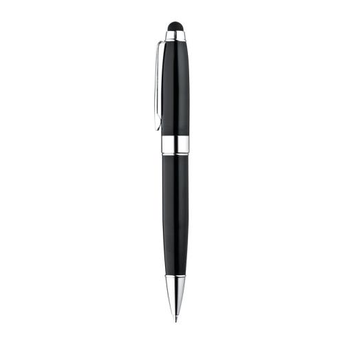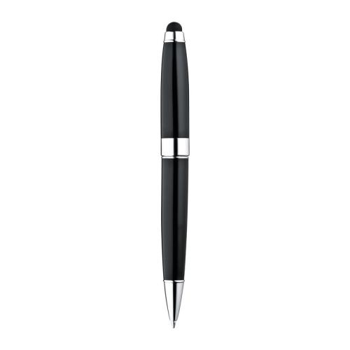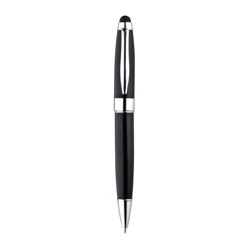 Rotary ball pen made of metal in classical design with blue-writing large refill and touch feature for smartphones or tablet PCs.