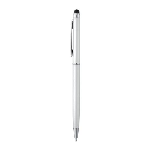 Rotary ball pen made of plastic in elegant slim shape, with blue-writing refill and practical touch pad for effortless handling of smartphones and tablet PCs.
