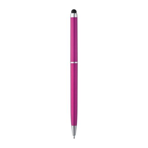 Rotary ball pen made of plastic in elegant slim shape, with blue-writing refill and practical touch pad for effortless handling of smartphones and tablet PCs.