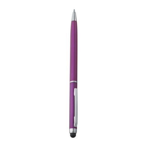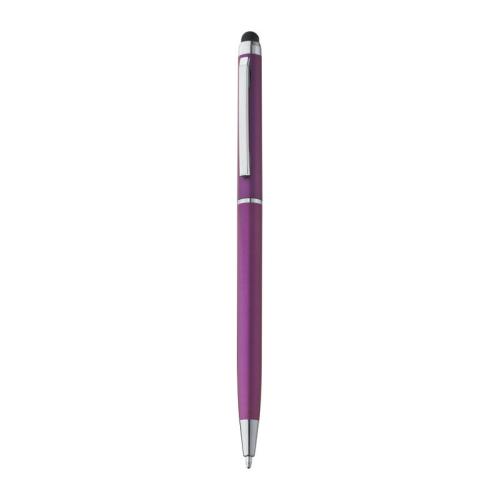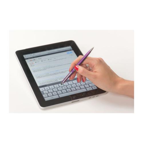 Rotary ball pen made of plastic in elegant slim shape, with blue-writing refill and practical touch pad for effortless handling of smartphones and tablet PCs.