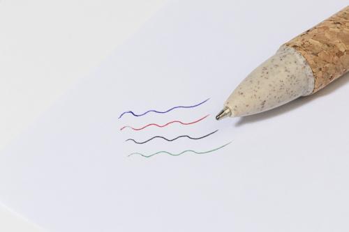 Ecological wheat straw plastic ballpoint pen with natural cork covered barrel. With 4 coloured refills: black, blue, green and red.