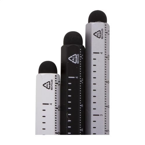 Recycled aluminium long-lasting inkless pen with touch stylus and metal alloy tip, which oxidizes the paper. With hexagonal barrel including 11 cm and 4 inch rulers. This pen writes similarly to a pencil, and it is also erasable.