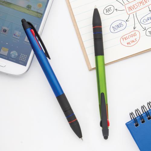 Plastic ballpoint and touch screen pen with rubberized grip and matte metallic finish. With 3 coloured refills: black, blue and red.