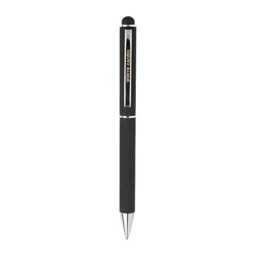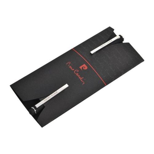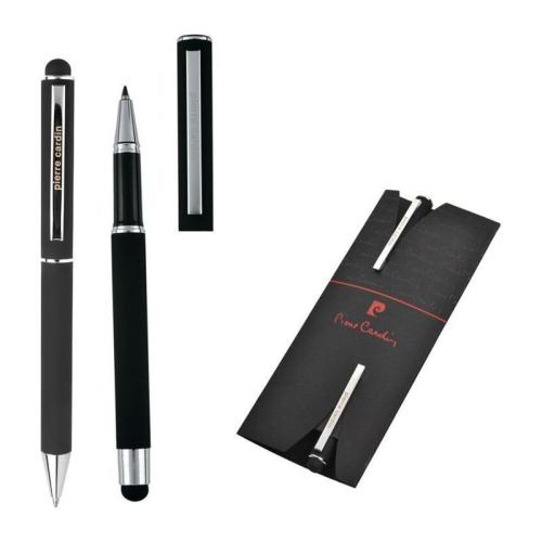 Luxury set of roller and ballpoint pen Pierre Cardin with aluminium body and rubber surface finish in black color. The roller contains a blue refill Schneider with the tip 0.5 mm, the ballpoint pen contains a quality blue refill with the tip 1 mm.