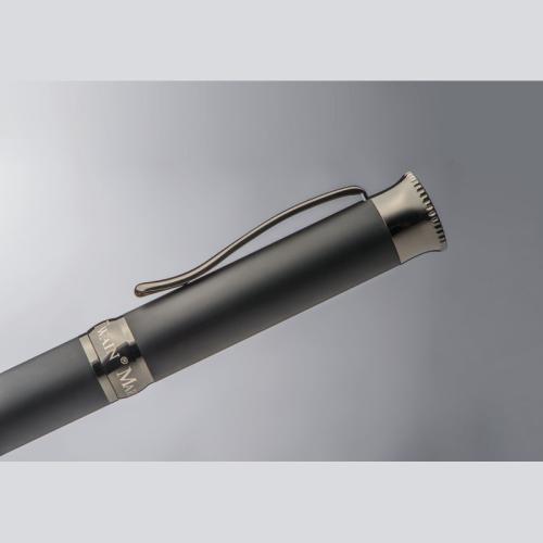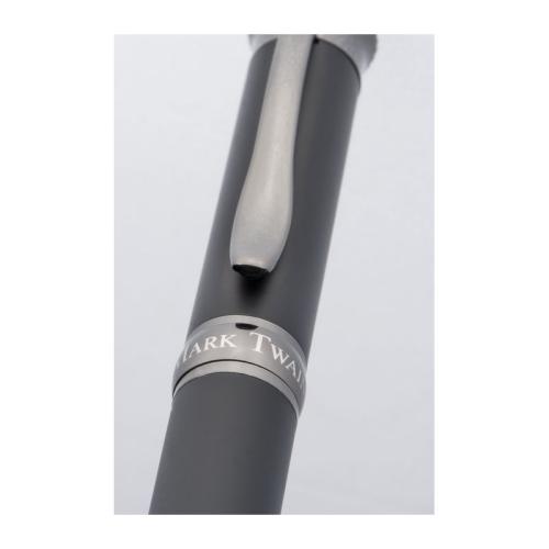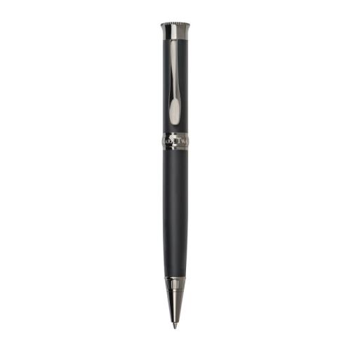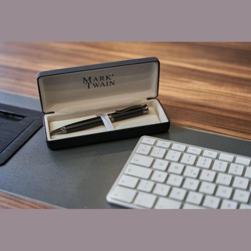 Mark Twain metal ballpoint pen with dark chromed applications and large blue-writing refill. Delivered in a noble case.