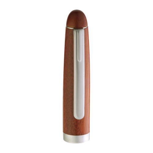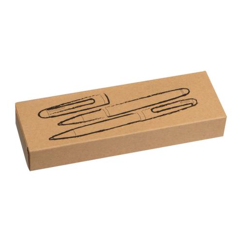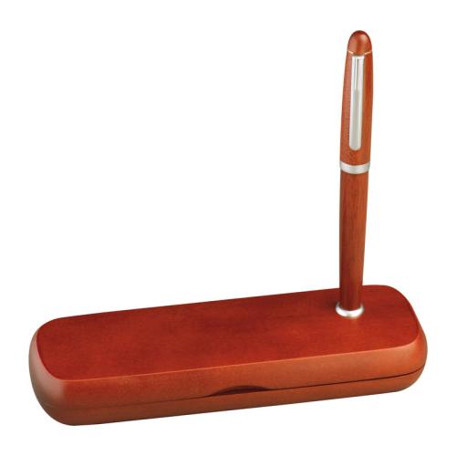 Wooden writing set consisting of a blue-writing ball pen with metal system refill and a fountain pen including a blue cartridge in a wooden box with ball pen stand.