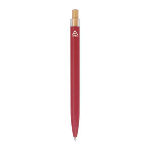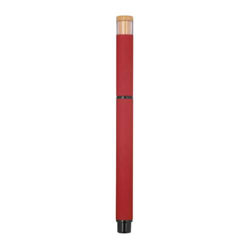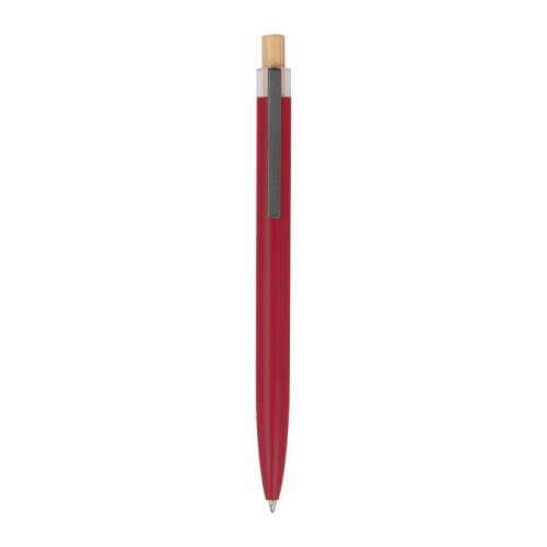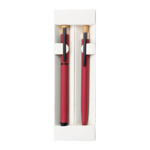 Writing set consisting of a ball pen with blue writing semi-gel refill and a rollerball made of recycled aluminium, with metal clip and bamboo pusher in an environmentally friendly box.