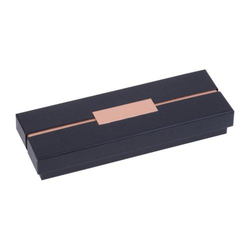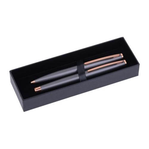 CrisMa metal writing set consisting of a twist ballpoint pen (800 m writing length) and a rollerball pen (500 m writing length) made of metal with rosegold-colored details. Both pens write in blue and come packaged in a black cardboard box.