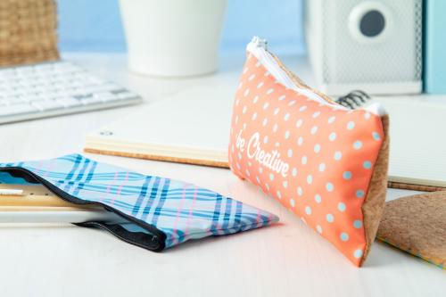 Custom made, zipped pen case in polyester with natural cork back. With sublimation printed graphics on the front side. MOQ: 50 pcs.