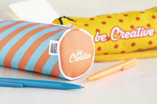 Custom made, round shaped zipped pen case in 600D RPET polyester. With all over sublimation printed graphics and distinctive RPET label. MOQ: 50 pcs.