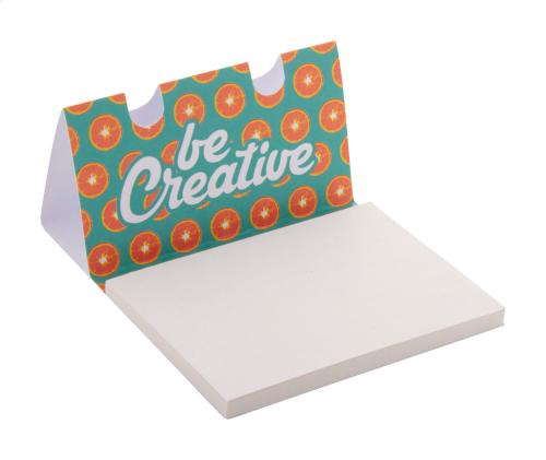 Custom made, paper pen holder with sticky notes. Includes 50 sheets of recycled paper sticky notes (100×75 mm). Price includes full colour printing on the top. MOQ: 100 pcs.