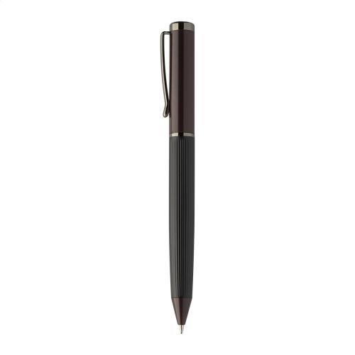Elegant, metal ballpoint pen and roller pen set with striped barrels, coloured accents and shiny gunmetal details. In matching colour gift box, with blue refill. André Philippe brand product.