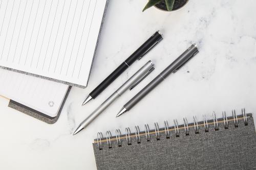 Recycled aluminium pen set with roller and ballpoint pen in black paper gift box. With blue refill.