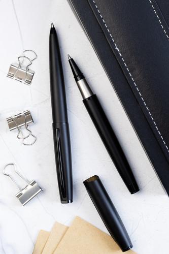 Elegant, metal ballpoint and roller pen set with matte black finish. In special paper gift box, with blue refill. André Philippe brand product.