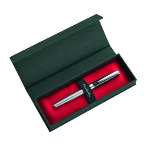 Luxury copper writing implements Pierre Cardin in a massive design. Nice combination of silver and black colour with fine engraving on lower part of the pen. The pen nib is protected by a cap in black colour.