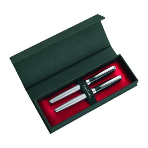 Luxury set of copper writing implements Pierre Cardin in a massive design. Nice combination of silver and black colour with fine engraving on lower part of the pen. The pen nib is protected by a cap in black colour.