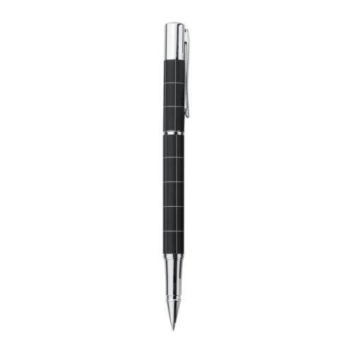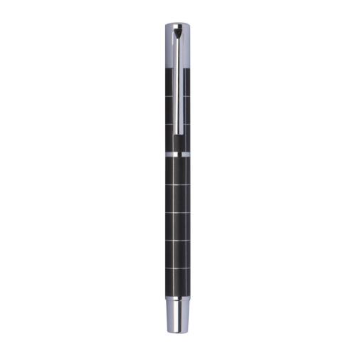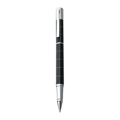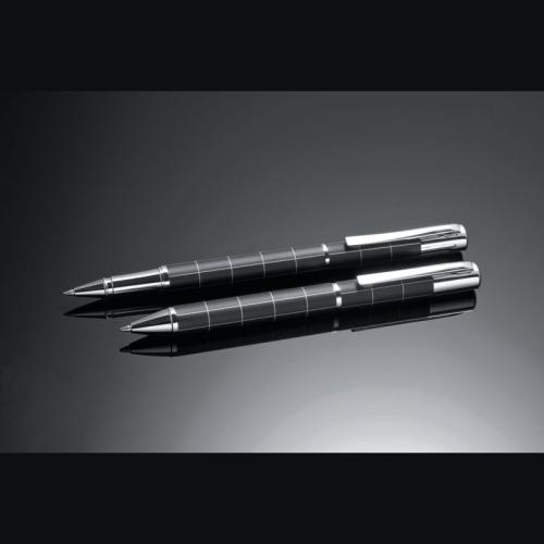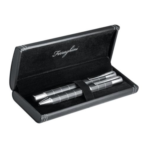 Classy Ferraghini metal writing set, consisting of a black-writing ball pen and a blue-writing rollerball in a wonderful case.