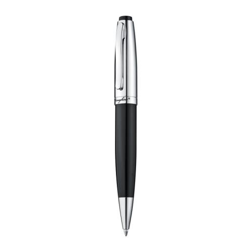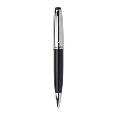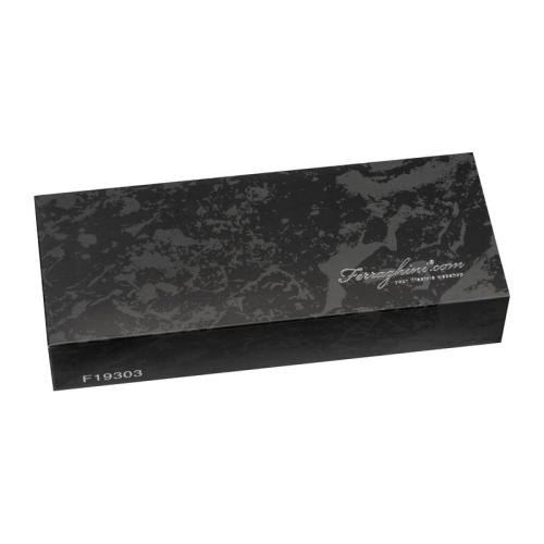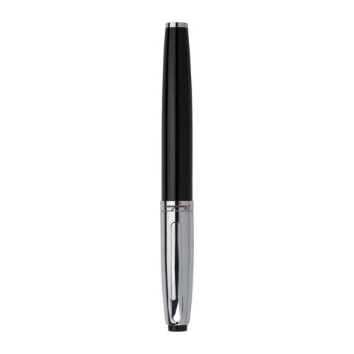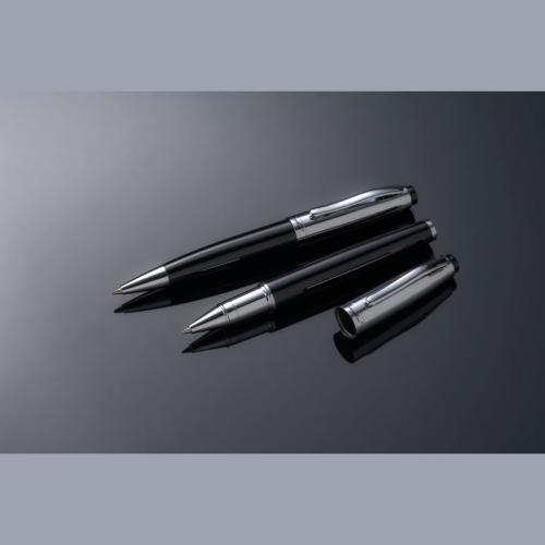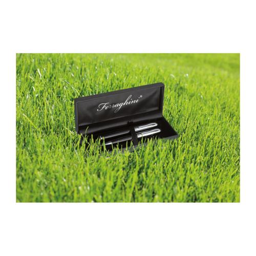 Classically elegant Ferraghini writing set consisting of a ball pen with twist mechanism and a rollerball pen (both blue-writing) in a black folding box.