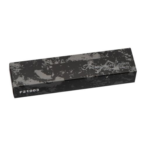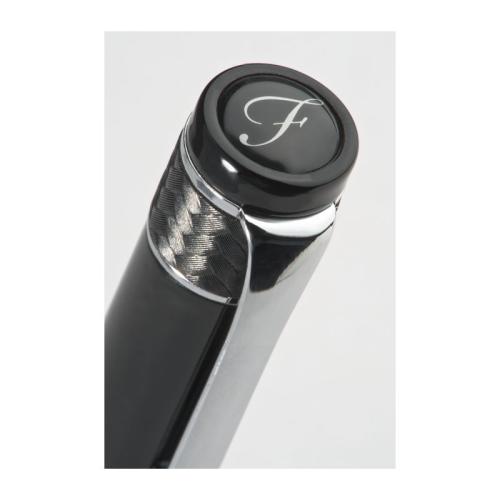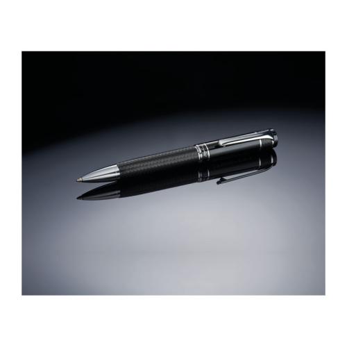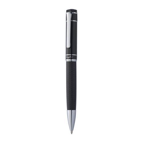 Luxurious Ferraghini ball pen with twist mechanism. The combination of black-lacquered surface and cloth cover in braided design is highlighted by occasional chrome accents. The blue-writing metal ball pen is stored in a velour padded artificial leather case with magnetic closure.
