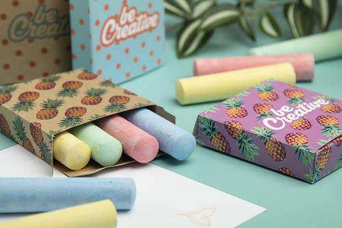 4 pc coloured chalk set in full colour printed kraft paper box. Price includes digital printing. MOQ: 100 pcs.