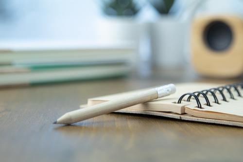 Mini wooden pencil in natural colour with eraser, sharpened.
