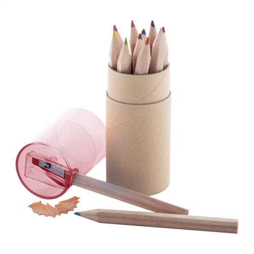 12 pc coloured pencil set in round cardboard case with plastic sharpener.