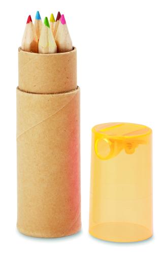 6 piece colouring pencils in recycled paper tube. Pencil sharpener transparent lid.
