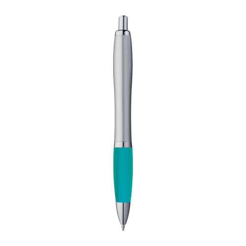 Ball pen with satin finish, rubber grip zone, and blue-writing large refill.