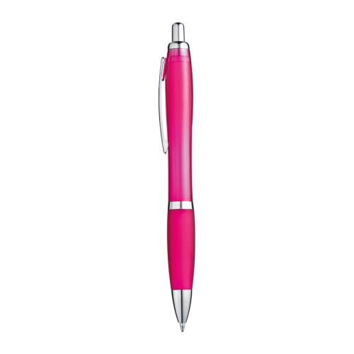 Transparent ball pen with silver metal clip, rubber grip zone and blue-writing large refill.