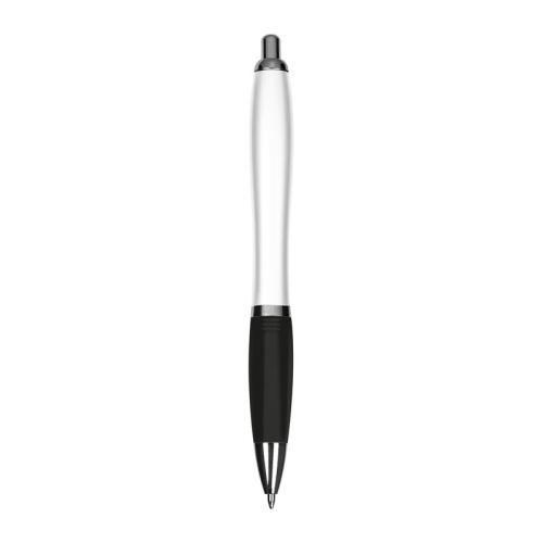 Plastic ball pen with white barrel, metal clip, blue-writing refill, and coloured rubber grip.