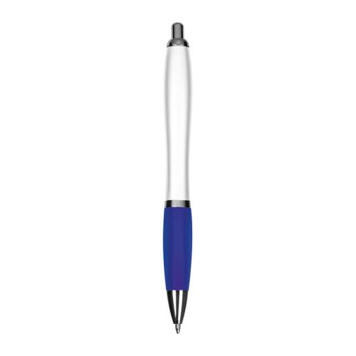 Plastic ball pen with white barrel, metal clip, blue-writing refill, and coloured rubber grip.