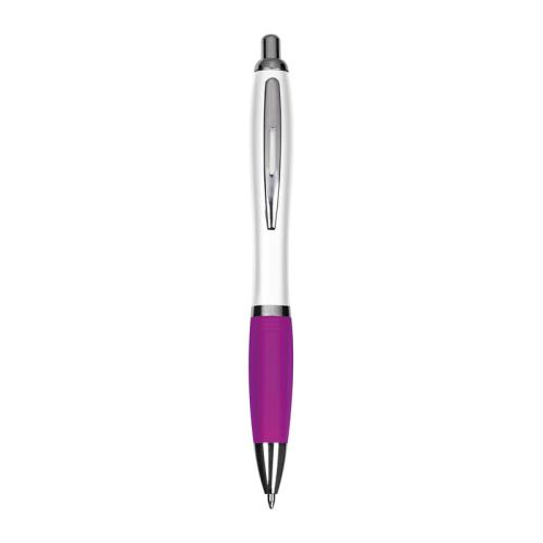Plastic ball pen with white barrel, metal clip, blue-writing refill, and coloured rubber grip.