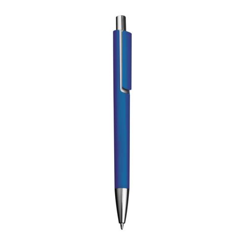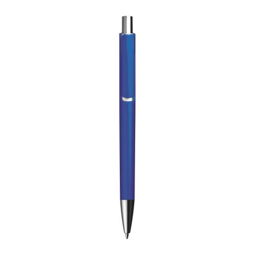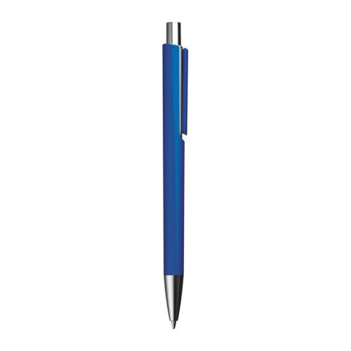 Colourful plastic ball pen with a jumbo blue-writing refill and silver applications.