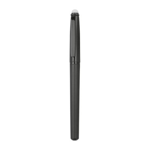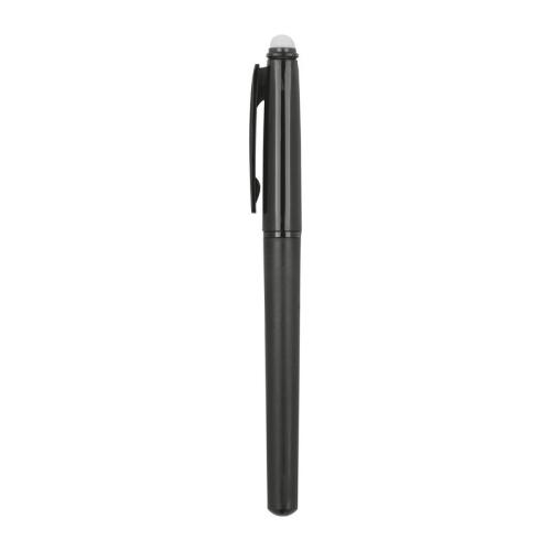 Erasable plastic gel pen with matching eraser on the outside of the cap. The pen colour matches the writing colour.
