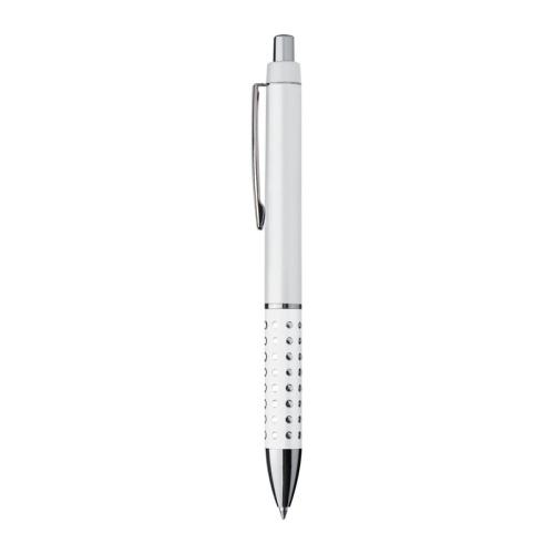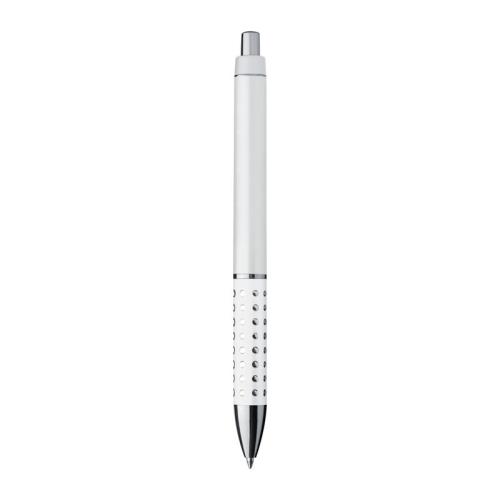 Plastic ball pen with sparkling dots grip zone and large blue refill.