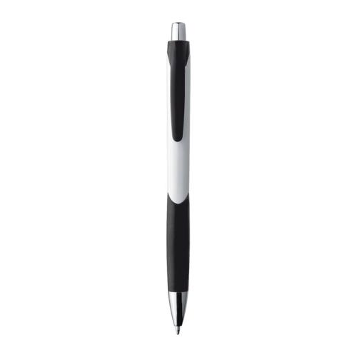 Ball pen with push mechanism, rubber grip zone, blue-writing refill, metal pusher and tip.