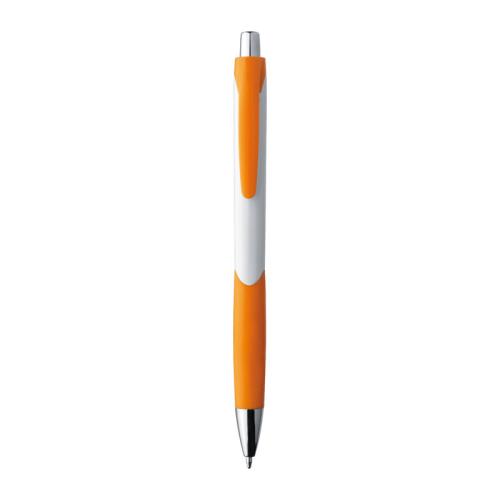 Ball pen with push mechanism, rubber grip zone, blue-writing refill, metal pusher and tip.