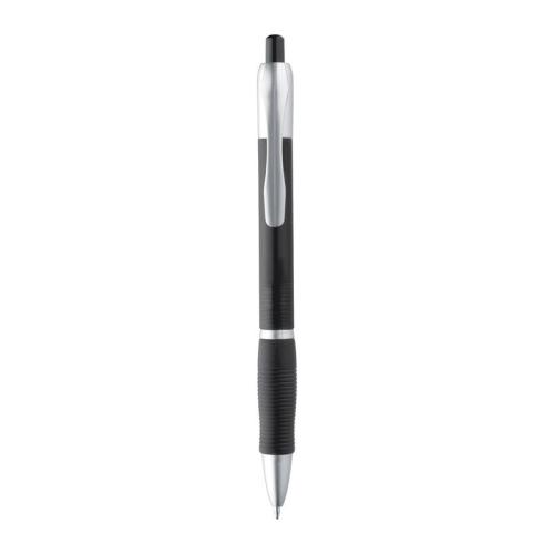 Plastic ball pen with push mechanism, blue-writing refill, and soft rubber grip zone.