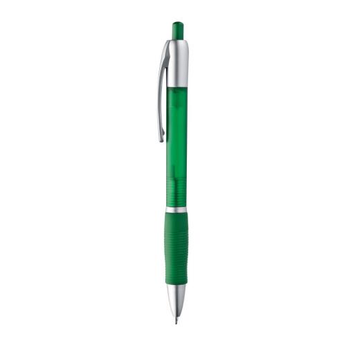 Plastic ball pen with push mechanism, blue-writing refill, and soft rubber grip zone.