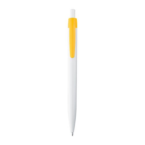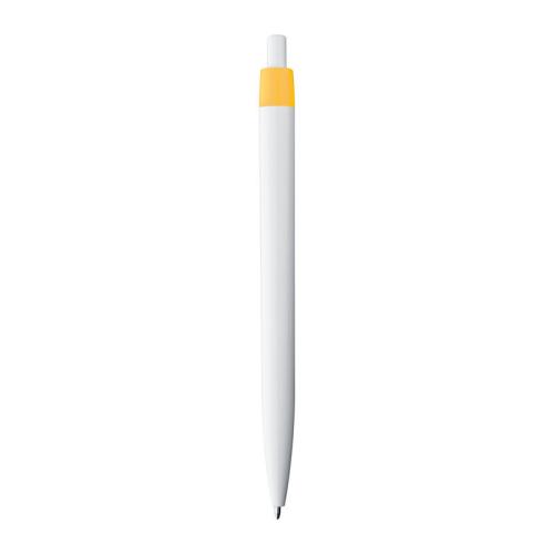 Trendy push-button ball pen with blue-writing refill. The white of the barrel highlights the colour of the clip.