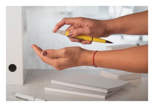Plastic ballpoint pen with blue refill and sanitizer spray on top. Capacity: 3 ml. Delivered without sanitizer liquid.