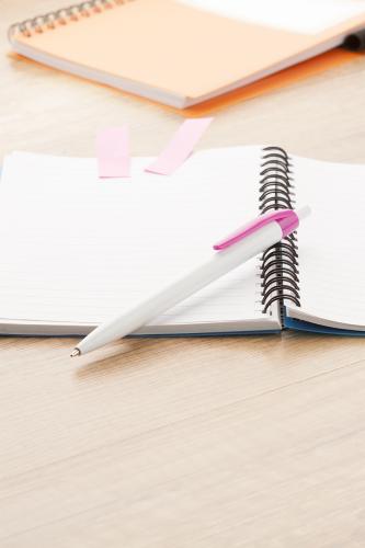 Plastic ballpoint pen with white barrel and coloured clip. With blue refill.