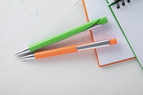 Plastic ballpoint pen with silver clip and chrome tip. With blue refill.