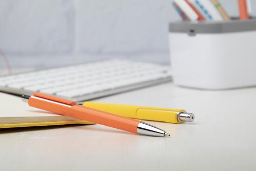 Plastic ballpoint pen with coloured barrel and chrome parts. With blue refill.