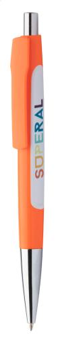 Plastic ballpoint pen with shiny chrome parts and large printing surfaces on the barrel. With blue refill.